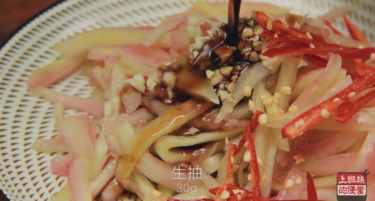▲在腌好的西瓜皮中放入蒜末,辣椒丝,淋入3勺生抽,1勺醋,1勺芝麻油,1小勺鸡精,用手抓匀,再腌制10分钟就可以吃啦。