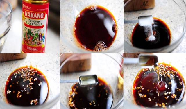 第二步:比例很重要。白糖、生抽、苹果醋按照1:1:1的比例各取一小碗,再配上半勺海鲜酱油。