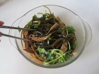 9、拌好的海带丝吃时盛一小盘中,表面撒些熟芝麻。