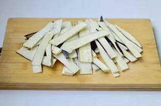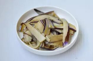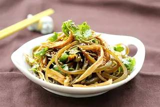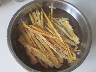 5、煮好后泡上一个小时捞出, 将豆棍切成细丝;