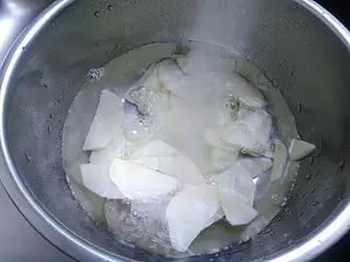 2、再放入沸水中煮熟(约2-3分钟,视土豆片的厚薄来定),但不能煮烂了,煮好后捞出