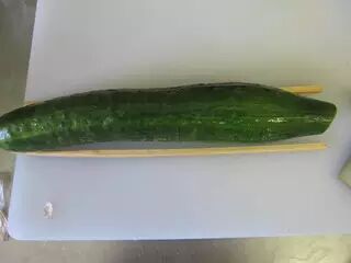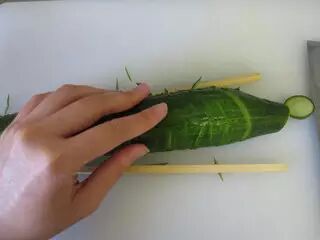 2、黄瓜底下两边分别垫两根筷子。斜45度切片,碰到筷子就停,这样黄瓜就不会切断啦。