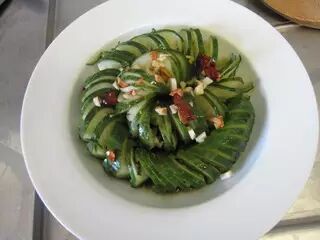 说的是一种切菜刀法,可以把黄瓜切成细薄的片状,每一片之间又不分离,围成一圈摆起来很好看。夏天到了就是各种凉菜出场的时候啦,凉拌菜的做法本来就不复杂,偶尔改变一下刀法,平常的菜也能吃出点新意来~