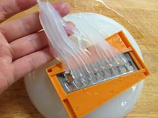 11、在凉粉上抹点凉开水,再用沾了水的擦丝器放在凉粉的一端,手上稍微带点劲刮到另一端,凉粉丝便做成了(做这一步手一定要洗干净哦)