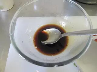 6、香醋一汤勺,白糖一汤勺,生抽半汤匙兑入一汤勺开水调匀成汁。