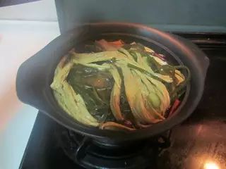 3、将准备好的原料放入煲中, 再加入酱油, 八角,桂皮和香叶,适量的水;