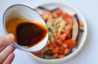 茄子1个、番茄1个、甜杏仁30g、辣椒酱1茶匙、酱油1汤匙、香醋2/1茶匙、鸡粉41茶匙