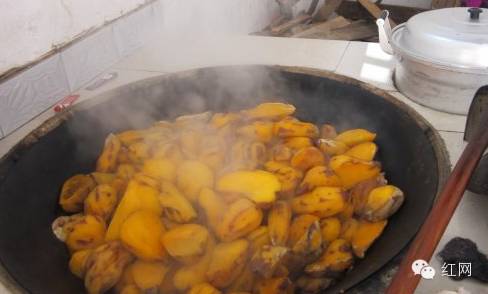 (手工红薯刮片全靠太阳天然晒干,因此,加工时须选择晴好天气。使得红薯片透气,迅速脱水。)