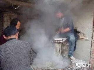 师傅将瓢端到开水上,用手轻轻地敲打瓢里的淀粉,粉丝便一根根掉进开水里。等粉丝一熟,就用木棒捞起来,挂在竹竿上。几分钟后,粉丝便结了霜,太阳一出,霜化了,一根根粘在一起的粉丝便分开了。粉丝晒干后,母亲将粉丝扎成一小把一小把的,有客来了,拿一把出来,煮开就是一大碗。