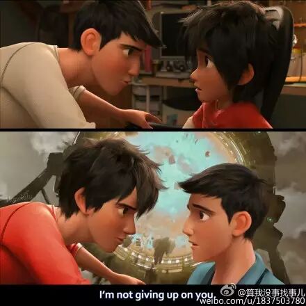 #超能陆战队# #BH6# 来自@supernovaaaaa 的梗,如果hiro长大,交换姿势盯着自己突然回来的哥哥……开展了一下脑洞,找回tadashi后,不仅姿势互换,连开口的第一句话也许也会和当初哥哥说得一样——“I'm not giving up on you.” (第一张原图,第二张是用第一张改画的~)