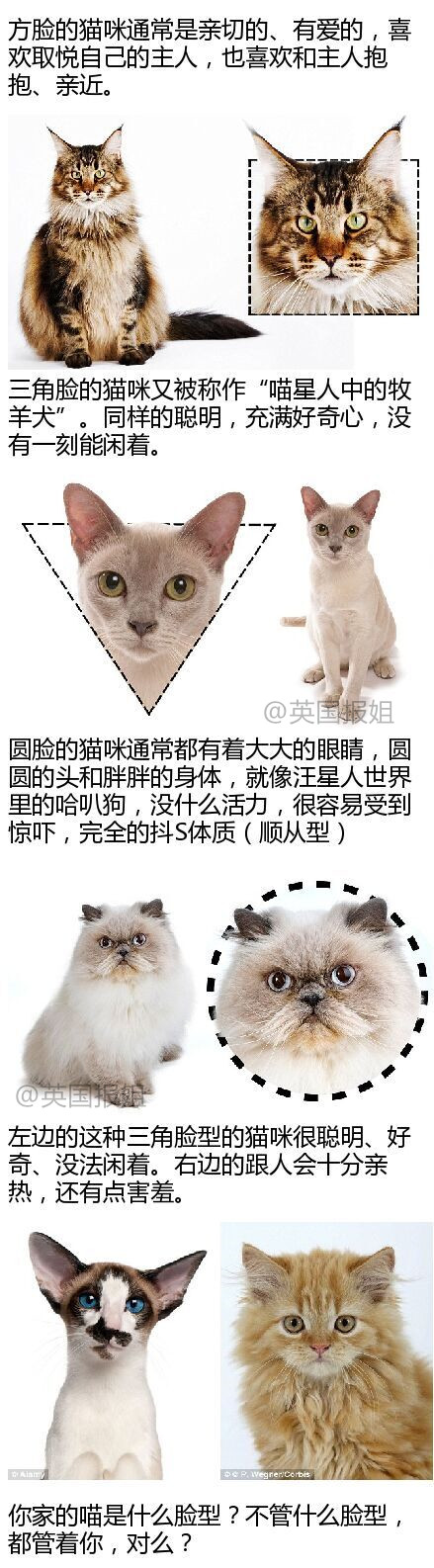 动物研究人员发现,猫咪的脸型可以显示它们的性格,方的很亲和、尖的很活泼。。。不知道你家的猫的性格是什么?