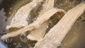 ③放入腐竹条开始油炸,事先将腐竹掰短。