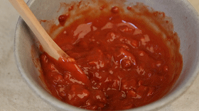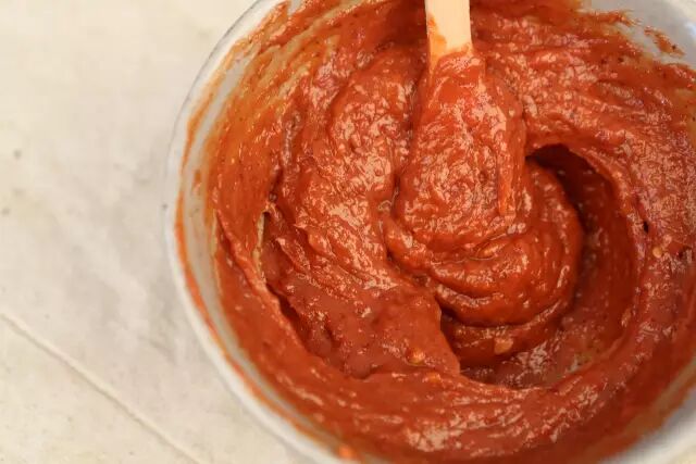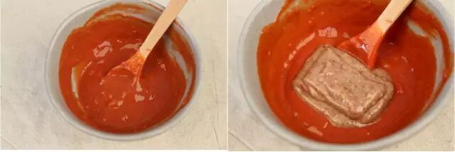 ⑥玫瑰腐乳三块放入碗中,用小勺搅拌成糊状。