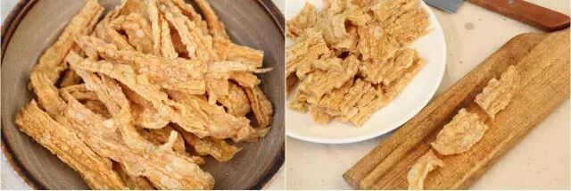 ⑤炸至金黄色即可捞出,放入事先加冷水的大碗中,浸泡30分钟以上,然后切成小段。