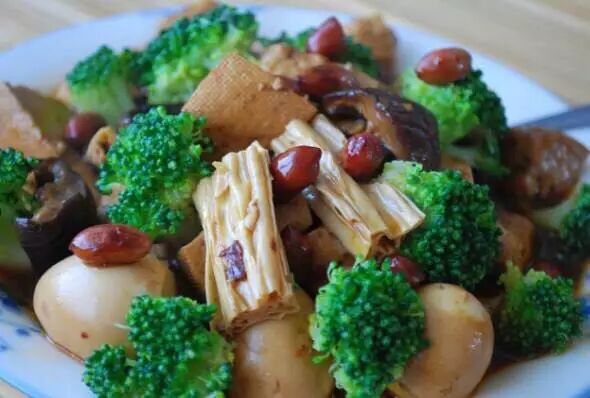 食材:西兰花,豆腐,腐竹,鹌鹑蛋,花生,香菇,辣椒酱,豆豉酱。
