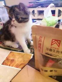 这次尝试的是真空包装的牛肉干,密封得还是很好,很扎实,包装比较得我心,有特色。我家菲咪看到吃的又迫不及待来代言了...哈哈