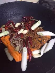 就是被这货吸引的,贵州风味的辣子鸡,跟重庆的辣子鸡有很大不同哈,重庆的辣子鸡肉切得比较小,炸得比较干,而且干海椒黑多,贵州辣子鸡切得比较大坨,海椒感觉是用的糍粑海椒