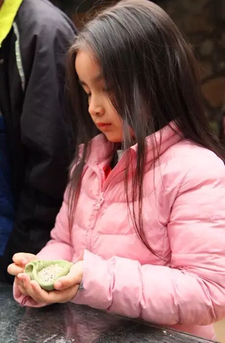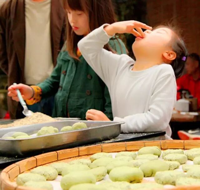 这个可爱的小姑娘,从开始到结束,一直在吃炒的香香的花生芝麻黄糖馅料。