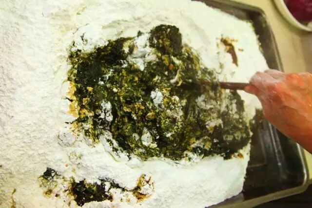 四:将艾叶捞起后,放在糯米粉里糅合,揉成面团。