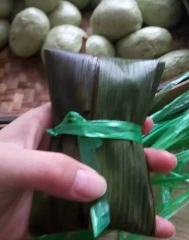 拿一片包粑叶平放左手上,右手拿刚刚揉好的艾粑团放在包粑叶上,然后合起来,用水草(或者细绳)绑起来,四个角一定要拉直。