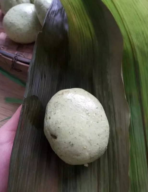 把浸泡好的糯米打成糯米粉,然后把艾叶用水煮(煮的越柔软越好),然后将糯米粉与煮好的艾叶放入一个瓷罐缸里,用全力揉面,用手捏成圆,然后挖个洞方便放馅料,再合起来揉圆。然后粘点茶油抹匀整个艾粑团,以便蒸的时候黏住包粑叶。