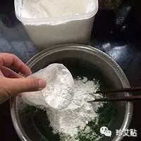 4. 得到了艾叶泥,预备用上糯米粉。也可以在糯米粉中掺入面粉,出来的面团就比较细腻光滑。我这里是使用纯糯米粉。