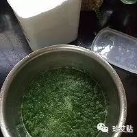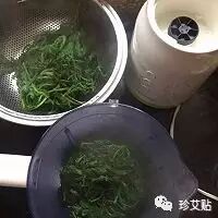 3. 艾叶滤掉水份,最好抓一下,挤出水份,不然涩味还是存在的。然后,将艾叶用搅拌机打成泥。(搅拌机中可以添入水份来搅拌)