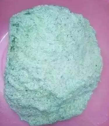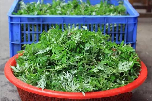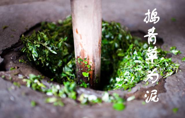 将刚采回来的艾叶挑选去除杂草和杂物,留下嫩叶嫩茎,用清水洗几次就可以稍微晾干,放入石槽里捣烂,捣成泥。