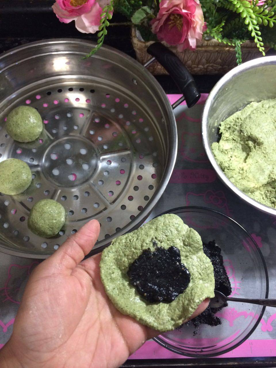 8 加上油和糖的馅料就有湿度,揪下一团面,包裹住馅料。