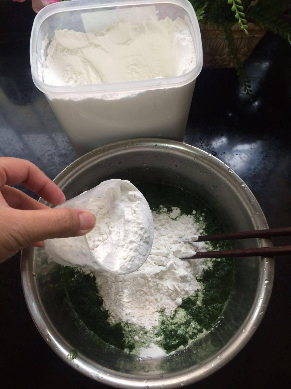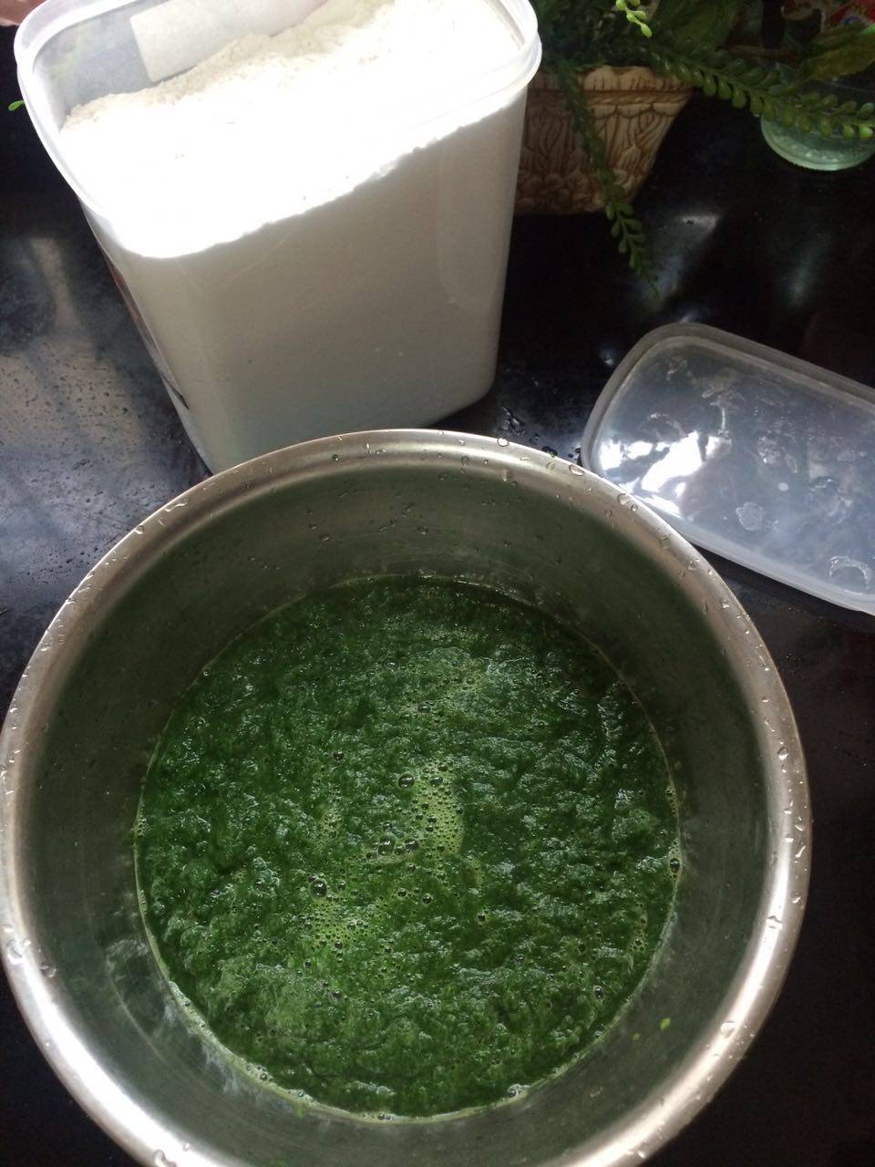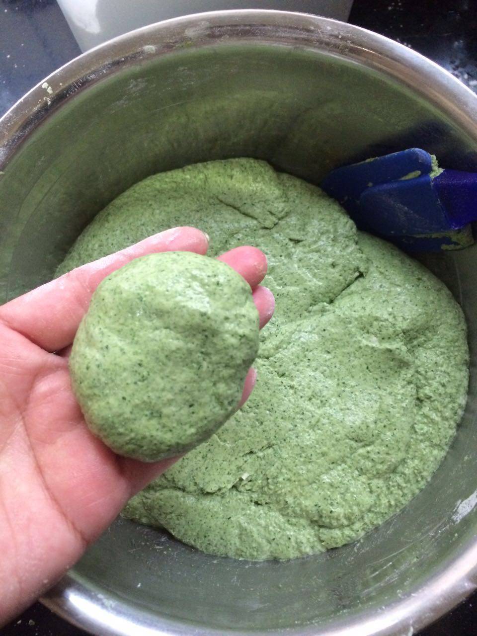 4 得到了艾叶泥,预备用上糯米粉。也可以在糯米粉中掺入面粉,出来的面团就比较细腻光滑。我这里是使用纯糯米粉。![image009.png]()