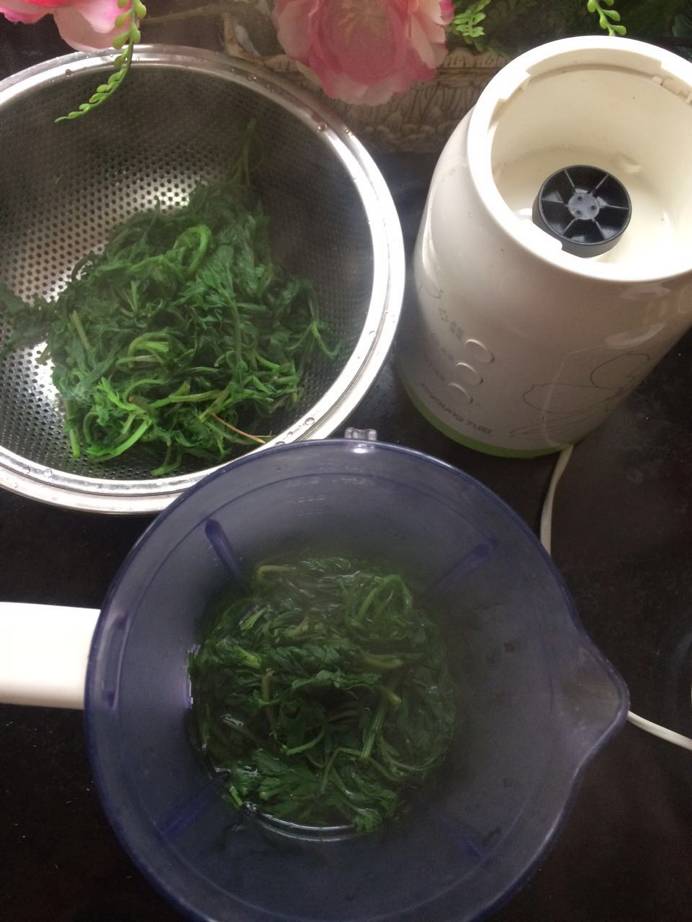 3 艾叶滤掉水份,最好抓一下,挤出水份,不然涩味还是存在的。然后,将艾叶用搅拌机打成泥。(搅拌机中可以添入水份来搅拌)![100052.png]()