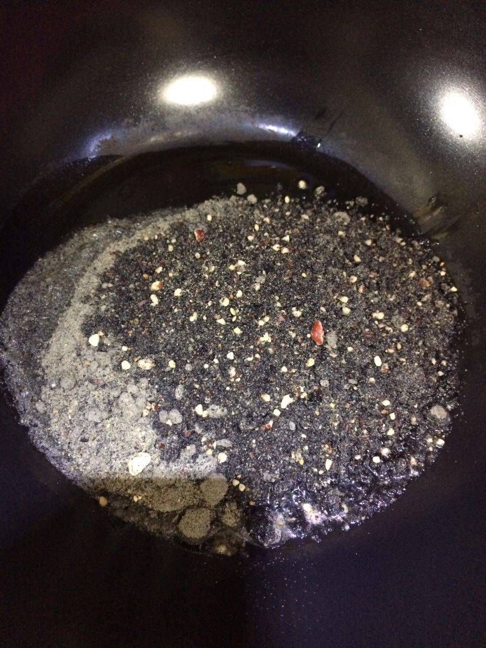 7 馅料,将芝麻花生研磨成粉,或者就是搅拌机打成碎粒都可。用猪油来炒至香味溢出,馅料就比较有特色,糖也是在这里加入,稍稍翻炒。 ![image015.png]()