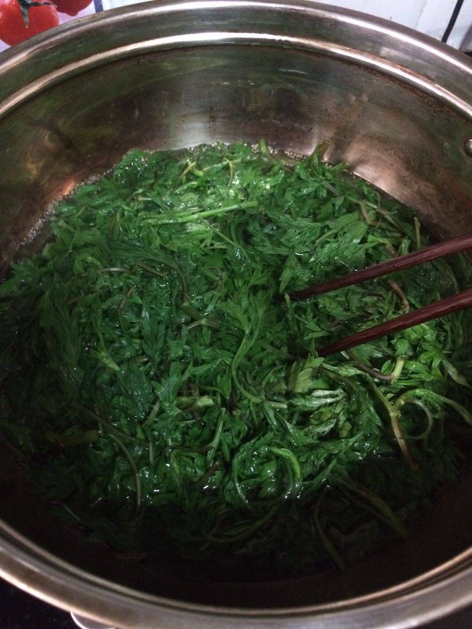 2 烧一锅沸水, 将艾叶入锅焯一下,去除它的涩味。