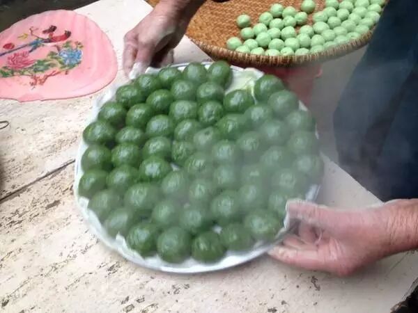 捏成一个个小圆团,浏阳人喜欢在里面加入白糖,然后像做包子一样包起来。