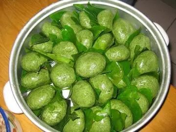 7、蒸锅里烧开水后,将制作好的艾粑粑放在玉米叶,或柚子叶上,放入蒸锅里大火蒸10分,关火连叶取出,即可食用。 凉吃风味更佳,若时间长了,艾粑粑太硬,可以入油锅煎香。(记者 胡志宏)
