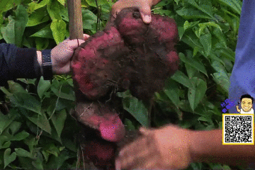 吃完腐竹,三位又去寻找其他食材了,这次“舅父新”发现了一颗红皮大薯,拿铲子挖了几下,一大块紫红色大薯就出来了,那要怎么处理呢?