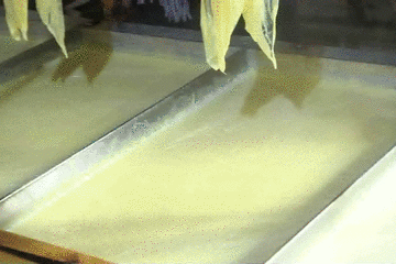 请这位阿叔示范下先:用刀将豆浆表皮轻轻割开,然后用手一捏,腐竹就出来了,再晾到竹竿上,然后再抹平豆浆表面,拨走泡沫,等待下一次的凝结。整个过程看起来相当简单。