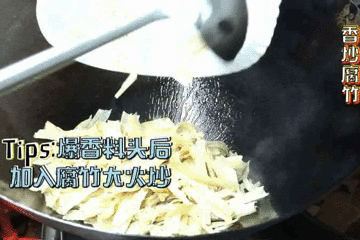 2、爆香葱姜蒜等料头后,将腐竹倒入,大火翻炒