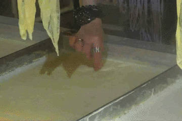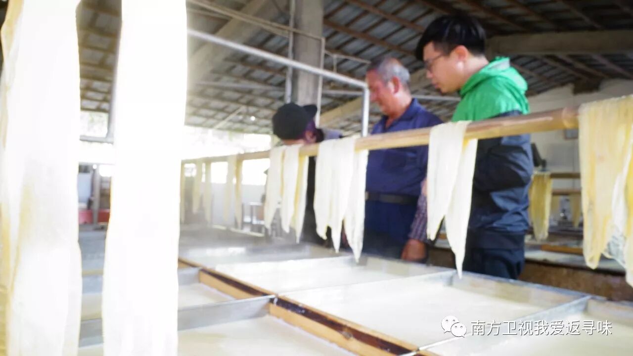 轮到嘉升了,同样都是被烫得哇哇叫。其实阿叔从事腐竹生产已经有几十年了,早就练出一双铁砂掌,所以才怕豆浆的高温。