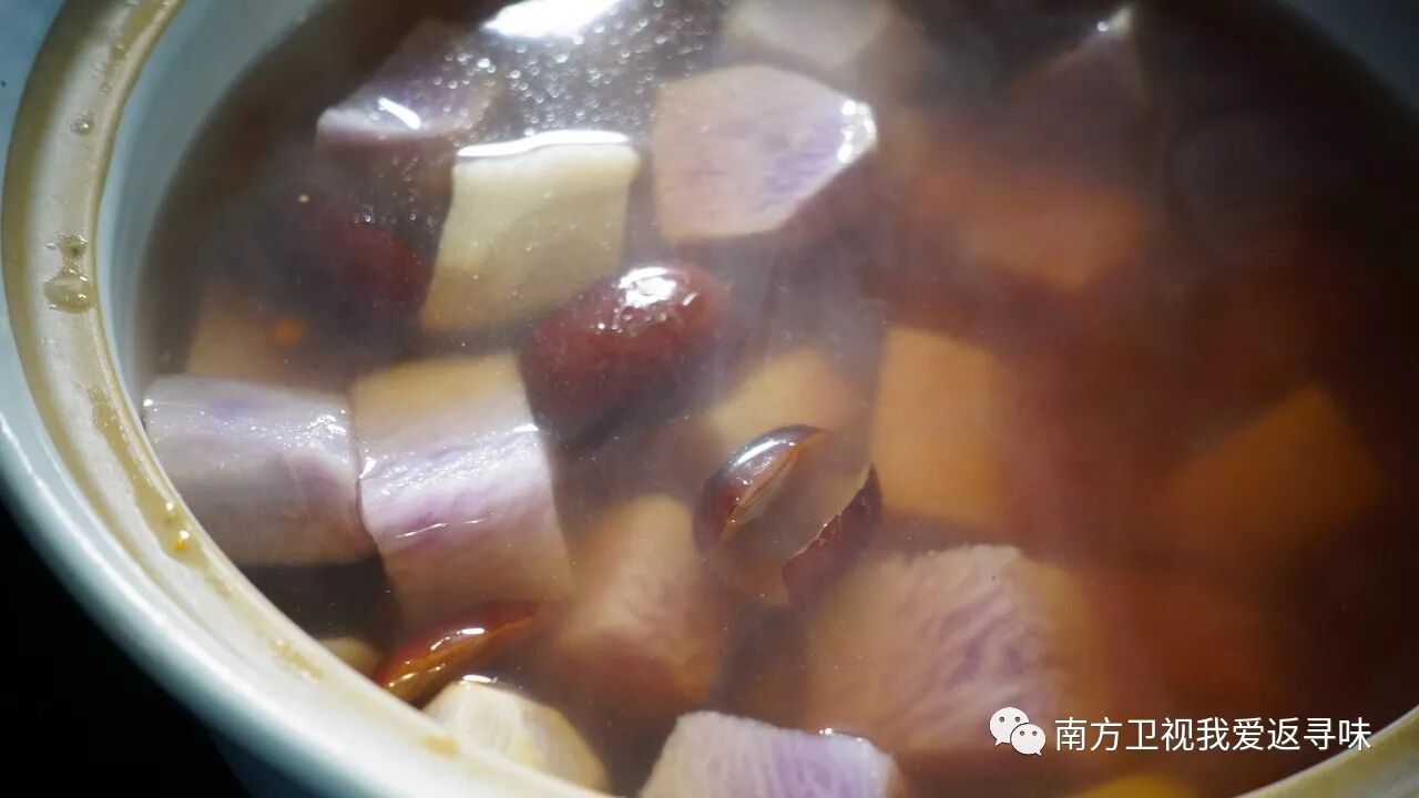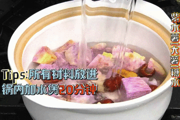 3、将大薯和红枣放入锅里,加水煲20分钟,再加冰糖和枸杞子,再煲5分钟即可