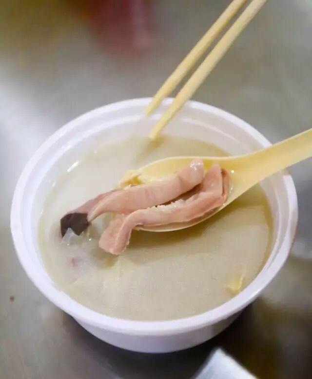 老板说:“很多人喝不惯我们的猪肚汤,觉得不够劲,但是这就是家常的猪肚汤味道。”确实,白果腐竹总给人糖水的感觉,因此这份猪肚汤不辣,反而喝出了淡到极致的甜。如果不爱腐竹,可以叫老板少装点。
