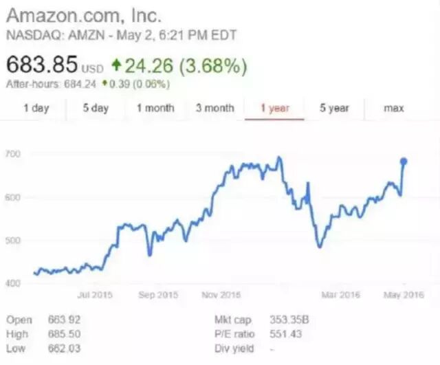 反正就是一些枯燥的数字,但是对于投资者来说,这些都是重大利好消息。于是在财报披露的当天,亚马逊的股价在盘后交易从$600每股一路蹿升$681.5每股,亚马逊的市值一下子就飙到了3,200亿美元。